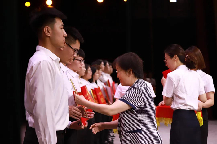 学校党委书记张洪英为考取硕士研究生的学生代表和优秀毕业生代表颁奖。