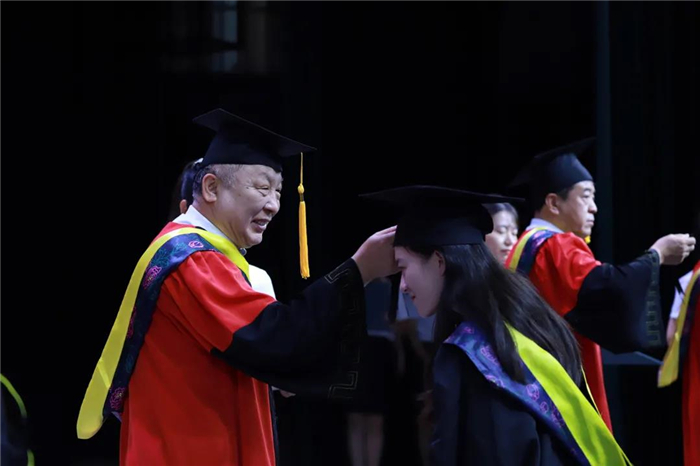 学位评定委员会主任梁玉国为毕业生代表拨正流苏