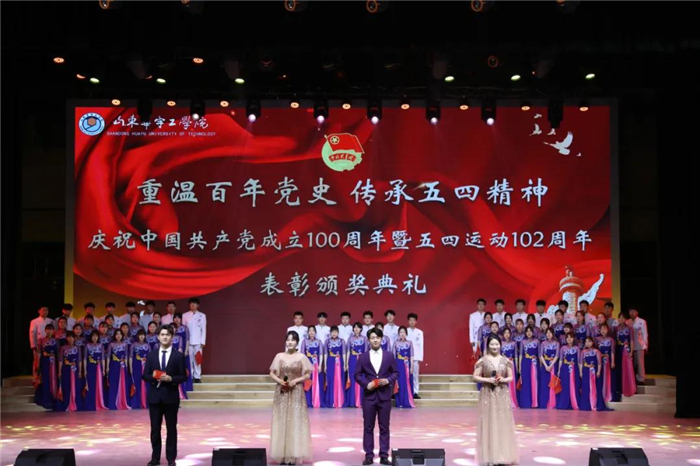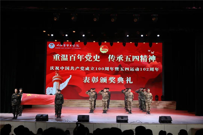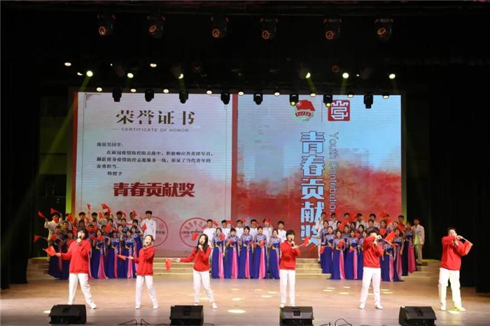 典礼现场,学校对2020年度国家奖学金、省政府奖学金获得者,省优秀科技社团及社团干部、省“三下乡”社会实践优秀集体及个人、市优秀共青团员及团干部等荣誉称号的团体和个人进行了表彰。歌曲《少年》(建党版)、《特色社团展示》、歌伴舞《奔跑的青春》、无伴奏小合唱《我爱你中国》等节目贯穿其中,紧扣庆祝建党100周年、纪念五四运动102周年主题,围绕青年主线,内容丰富多彩、教育意义深刻,实现了思想性、艺术性、教育性的有机融合。