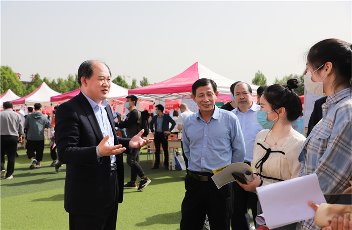 执行校长梁玉国陪同省市区有关部门领导走进招聘会现场,与企业招聘人员互动交流,介绍我校人才培养和产学研合作育人情况,认真听取用人单位对人才的需求。