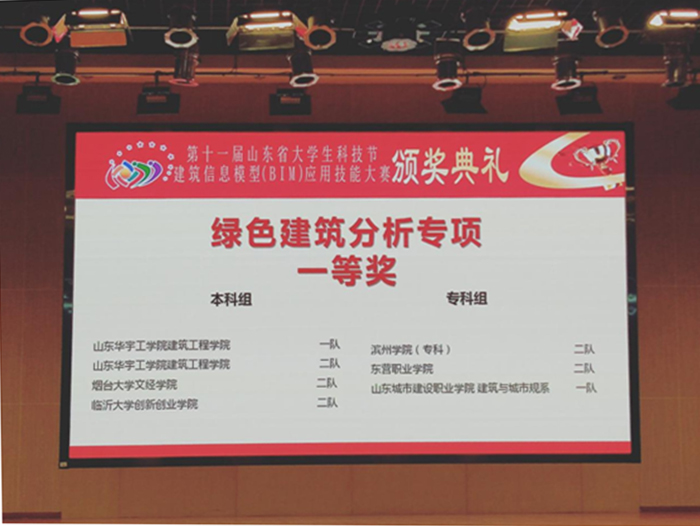 近日,山东省教育厅、共青团山东省委员会、山东省人力资源和社会保障厅等六单位联办的“第十一届山东省大学生科技节—山东省大学生BIM 应用技能大赛”在青岛理工大学(临沂)举行,我校4支队伍参加了全部项目的比赛,同省内68所高校同台竞技,最终取得了本科组一等奖6项、二等奖7项、三等奖2项的优异成绩。
