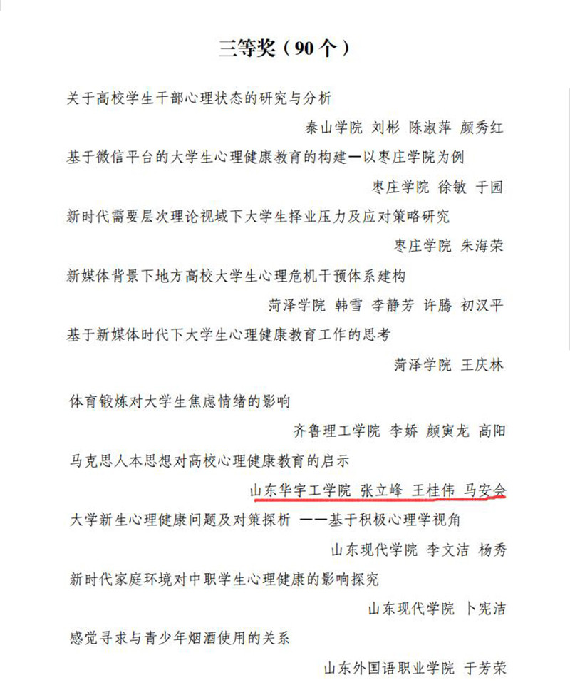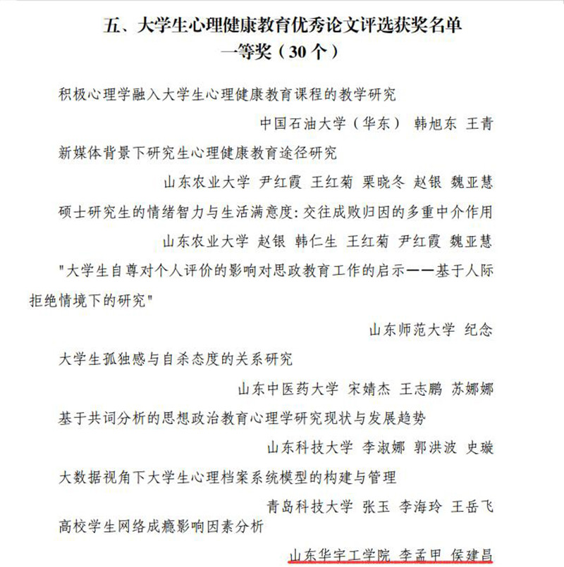 在此次大学生心理健康节中,我校师生积极参与了大学生朋辈心理辅导技能大赛、心理健康教育优秀论文评选、心理情景剧短片DV大赛、十佳大学生心理健康教育明星微平台等7项比赛。其中,我校李孟甲老师等撰写的《高校学生网络成瘾影响因素分析》荣获山东省高校心理健康优秀论文一等奖,是唯一获得一等奖的民办高校代表;张立峰老师等撰写的《马克思人本思想对高校心理健康教育的启示》荣获山东省高校心理健康优秀论文三等奖;我校学生孙静钰、韩君侠、耿秋月组成的“心之翼”团队与山东大学、中国石油大学等92所高校同台竞技,经过激烈的角逐,最终荣获山东省高校大学生朋辈心理辅导技能大赛二等奖,在山东省民办高校中成绩排名第一。