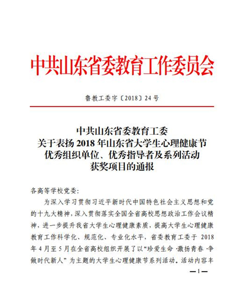 近日,中共山东省委教育工委发布了《关于表彰2018年山东省大学生心理健康节优秀组织单位、优秀指导教师及系列活动获奖项目的决定》,对获奖单位、个人及获奖项目进行了通报表彰。我校师生在本届心理健康节各项活动中表现突出,荣获一等奖1项、二等奖1项、三等奖1项。