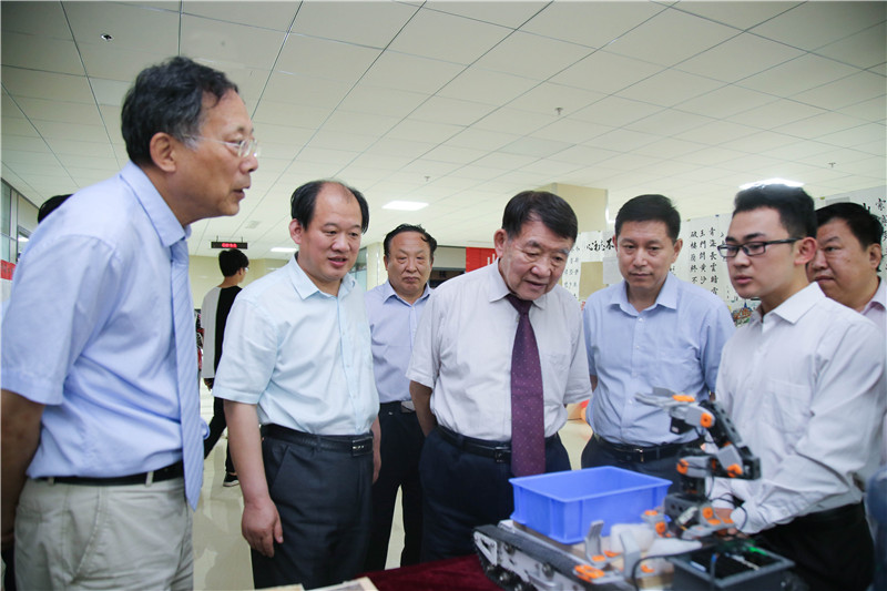 王院长一行首先饶有兴致地参观了我校“第四届大学生科技文化艺术节作品展”,并在学校行政楼906会议室与学校领导进行了交流。学校执行校长梁玉国简要汇报了学校的发展历程、办学定位、发展目标和愿景。王尧院长对学校的发展给予了高度评价,对杨东堂董事长的办学情怀表示敬重。双方就我校充分发挥企业集团办学优势,与中国电子工程设计院、中国电子学会洁净技术分会加强产学研深度合作,建设超洁净实验室、培养洁净领域工程技术人才、培育国家级重点学科专业等方面进行了深入交流,并达成共识。