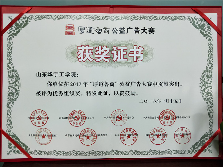 2月20日,山东省“厚道鲁商”公益广告大赛落下帷幕,我校设计与艺术学院教师闫鹏制作的作品《厚道鲁商,诚信天下》获得广播类银奖、《秉承厚道鲁商精神 铸就现代商业传奇》获得广播类优秀奖,我校荣获优秀组织奖。