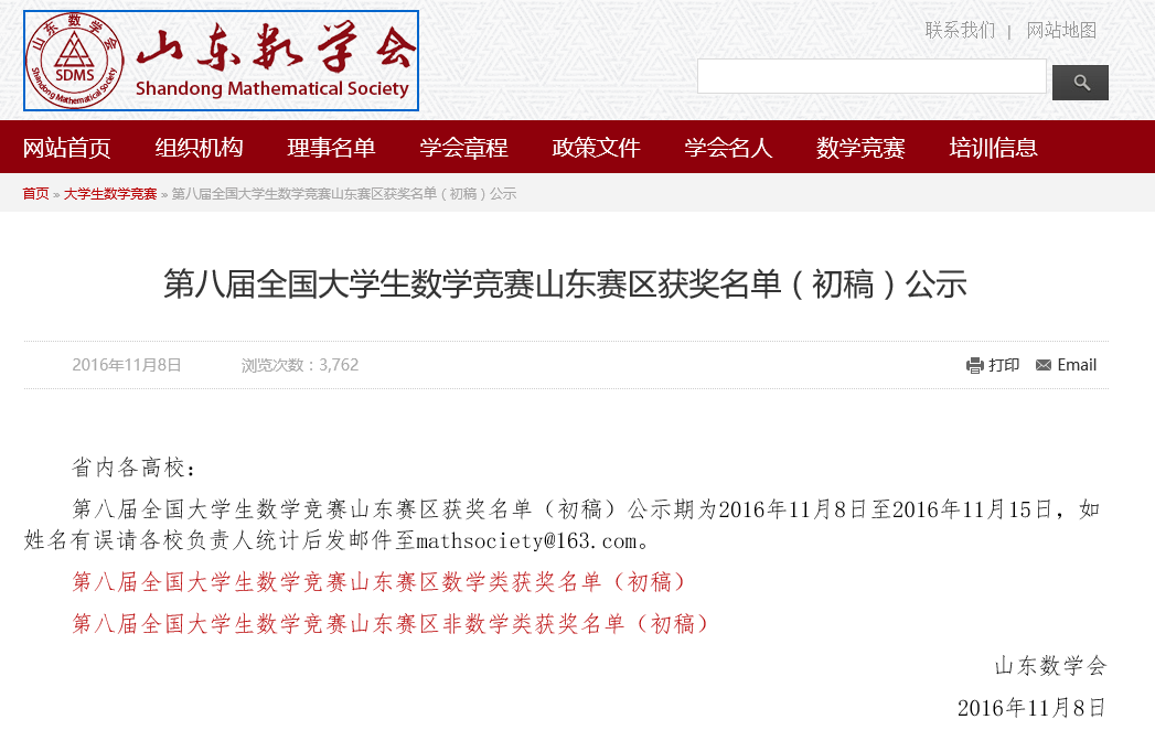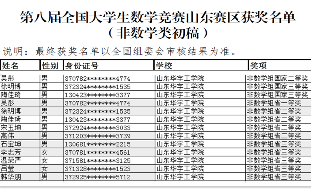 11月11日,第八届全国大学生数学竞赛暨第七届山东省大学生数学竞赛全国大学生竞赛山东赛区组委会公示了大赛成绩,我校共获得本科非数学专业组全国二等奖1项,全国三等奖2项;山东省一等奖1项,二等奖4项,三等奖5项。