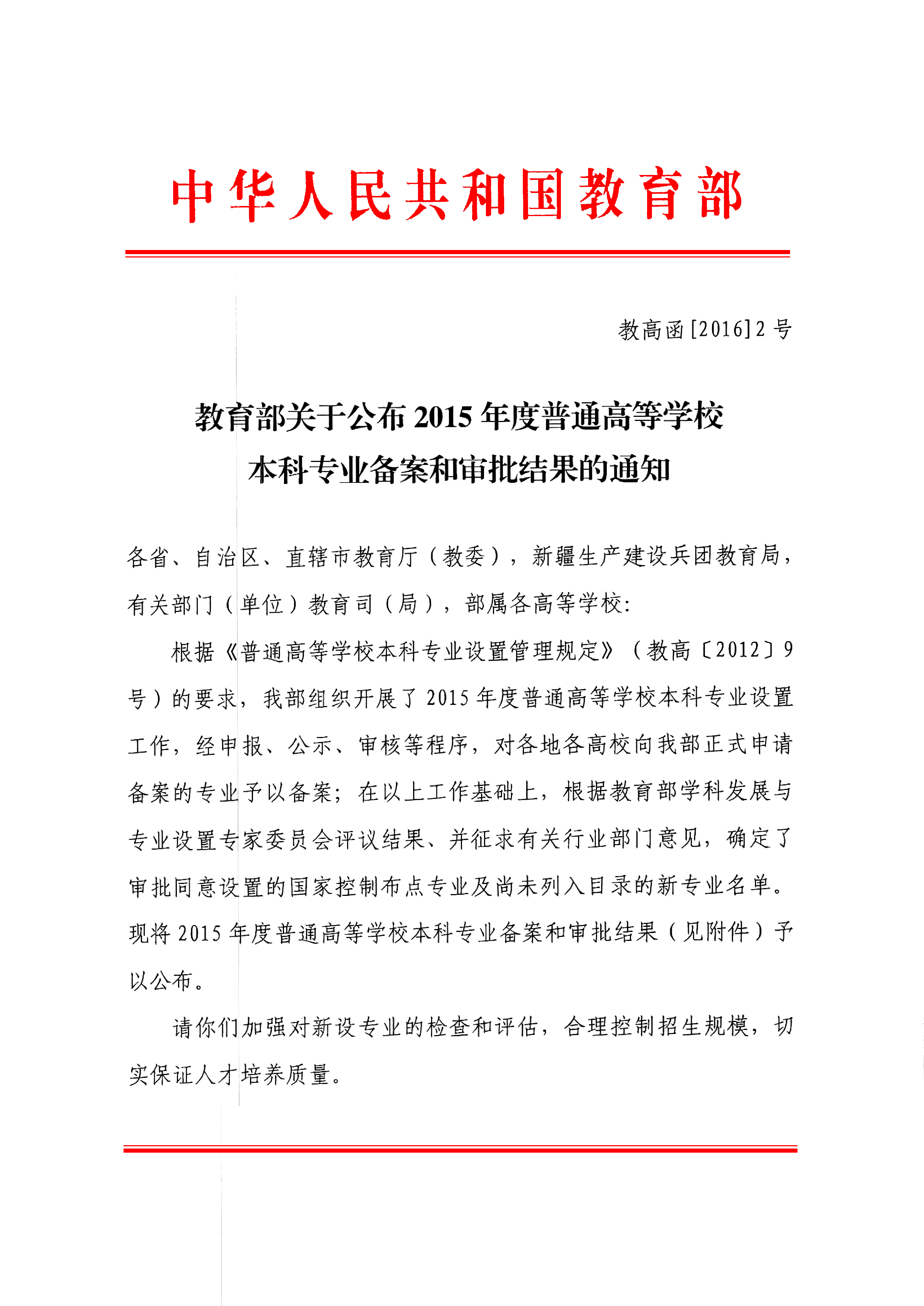 近日,教育部下发了《关于公布2015年度普通高等学校本科专业备案和审批结果的通知》(教高函[2016]2号),我校2015年申报的拟于2016年招生的机械电子工程、网络工程、工程造价、物流工程、工业工程共5个本科专业全部获批,5个新增专业将于今年秋季开始招生。截至目前,我校的本科专业总数达到12个,涵盖工学、管理学两大学科门类。