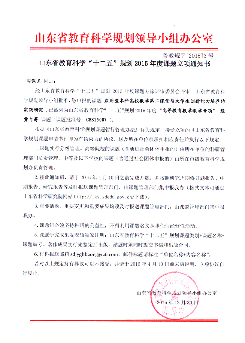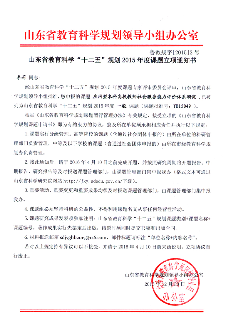 近日,山东省教育科学规划领导小组办公室公布了山东省教育科学“十二五”规划2015年度课题立项名单,我校有5项课题获准立项,取得如此可喜的成绩既是对我校项目管理工作的肯定,更是对我校一线教师教学研究能力的认可。