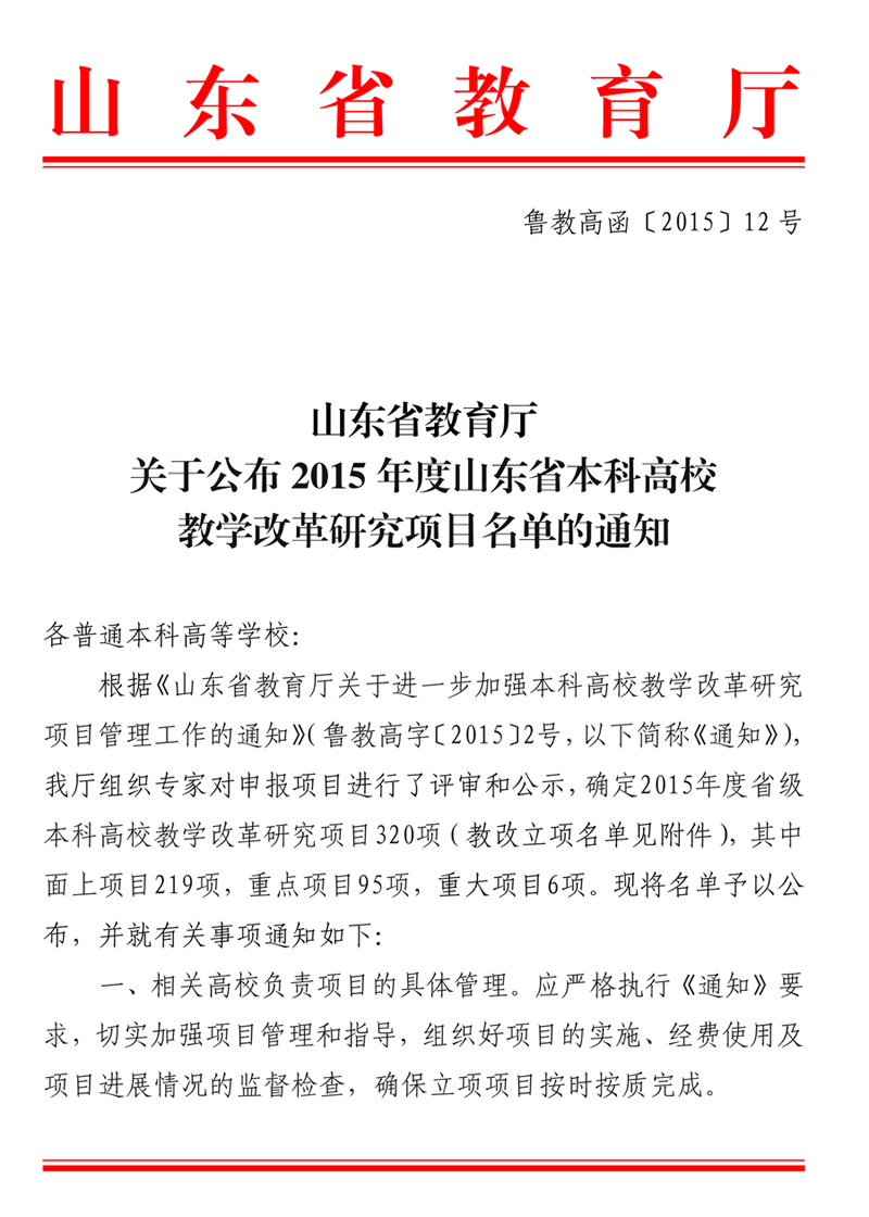 据《山东省教育厅关于进一步加强本科高校教学改革研究项目管理工作的通知》(鲁教高字〔2015〕2号)文件精神,省财政将设立专项经费,对立项项目进行资助,其中,重点项目每项资助10万元,面上项目每项资助5万元。我院贺红岩老师获准立项的是面上项目,将获得省财政的5万元经费资助。
