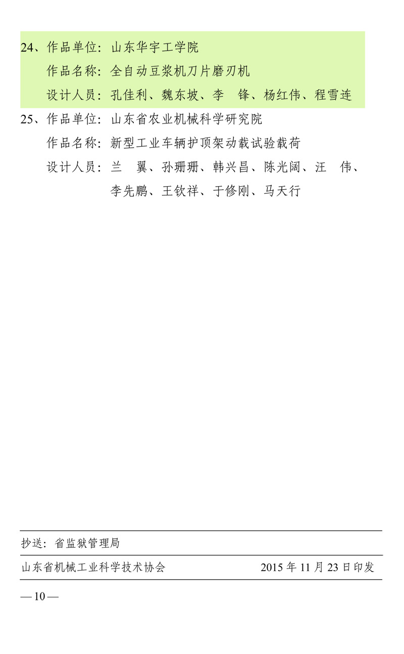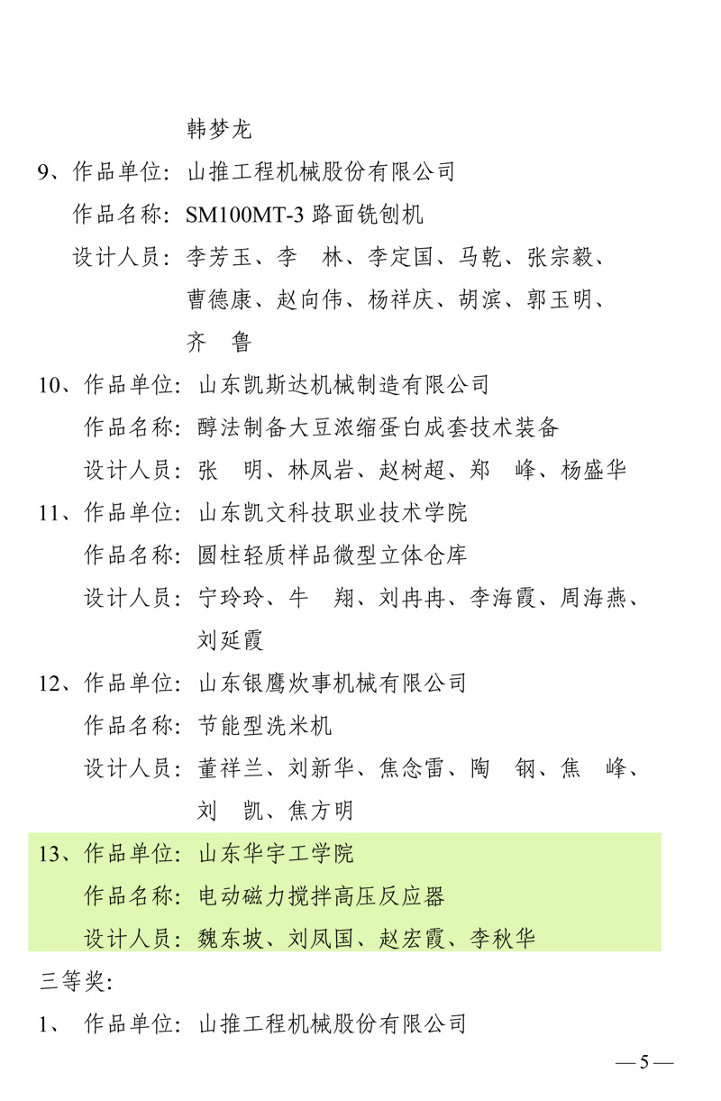 12月7日,山东机械网公布了《关于表彰2015第一届山东省机械工业技术与工艺创新大赛获奖单位和人员的决定》。我院参赛的两项作品全部获奖,其中我院魏东坡老师主持的《电动磁力搅拌高压反应器》项目获得全省二等奖;孔佳利老师主持的《全自动豆浆机刀片磨刃机》项目获得全省三等奖。并授予魏东坡老师“山东省国防机械电子工业系统五一劳动奖章”的称号,授予孔佳利等三位老师“山东省机械行业优秀科技工作者”的称号。