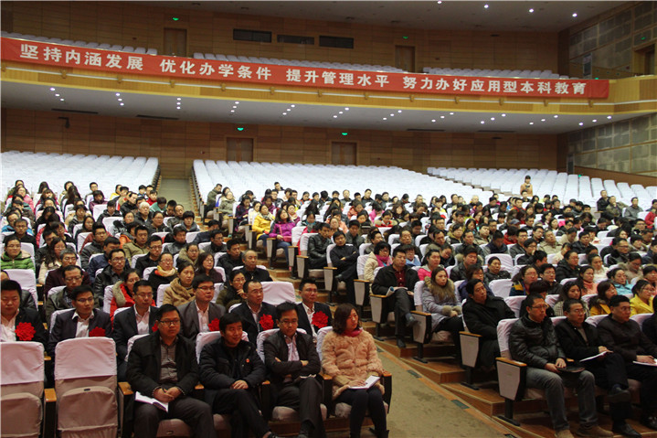 梁院长指出,2015年学院工作的总体要求是:以科学发展观为指导,全面贯彻党的十八大和十八届三中、四中全会精神,深入学习贯彻习近平总书记系列重要讲话精神,进一步理清办学思路。以安全稳定为前提,以创建高水平应用型本科名校为目标,以顶层设计为引领,以制度建设与执行为保障,坚持以质量为核心的内涵发展,适度扩大办学规模、优化师资队伍、改善办学条件、加强教学建设、改进学风建设、提升科研与社会服务水平,深入开展“教育教学管理提升年” 活动,全面提升教育教学和管理水平,不断提高人才培养质量,努力办好应用型本科教育。