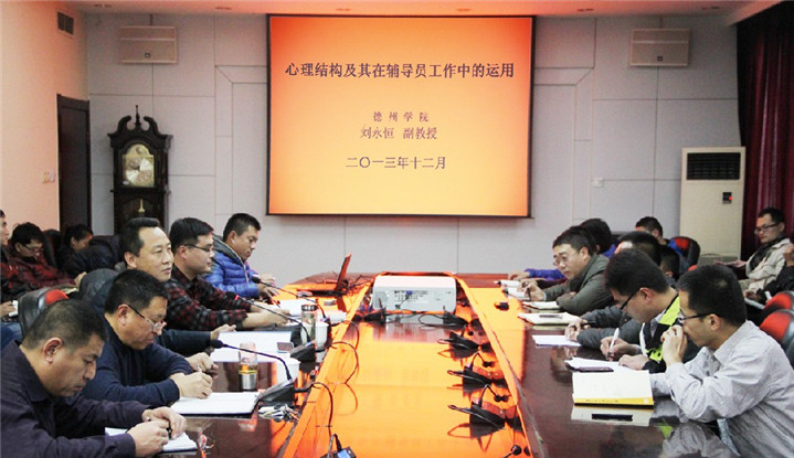 为了让辅导员掌握心理学、教育学知识,并运用于工作中,努力提高辅导员疏导心理困惑开展心理咨询的能力、辅导学生发展的能力、参与应对和处理危机的能力。我院于12月5日下午,邀请德州学院心理学副教授刘永恒老师在中会议室为全体辅导员作了题为《心理结构及其在辅导员工作中的运用》的报告。报告由学生处处长侯建昌主持,院长助理张宜经、各系部学管主任及全体辅导员出席本次报告会。