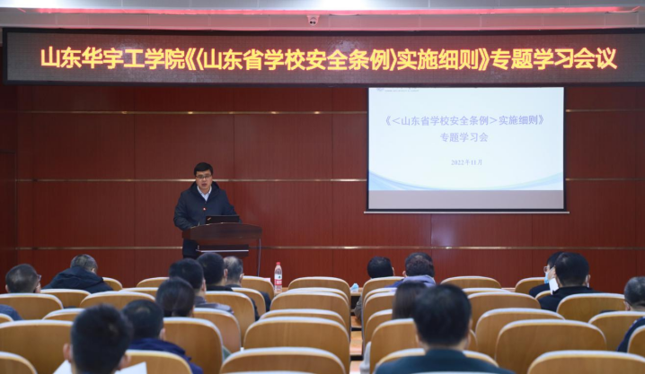11月21日下午,学校在学术报告厅召开专题会议,就学习宣传贯彻《〈山东省学校安全条例〉实施细则》(以下简称《实施细则》)进行安排部署。党委副书记、副校长高挺进,校长助理、学生工作处处长侯建昌出席了会议,学校各部门(单位)主要负责人、分管学生工作的副院长参加了会议。