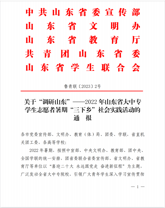 近日,中共山东省委宣传部、山东省文明办、山东省教育厅、共青团山东省委、山东省学生联合会发布《“调研山东”——2022年山东省大中专学生志愿者暑期“三下乡”社会实践活动通报》。其中,我校团委再次荣获“优秀组织单位”;邢永亮等5位教师荣获“优秀指导教师”;侯雅楠等30名学生荣获“优秀学生”;信息工程学院“红日逐梦”社会实践团队荣获“优秀服务队”。