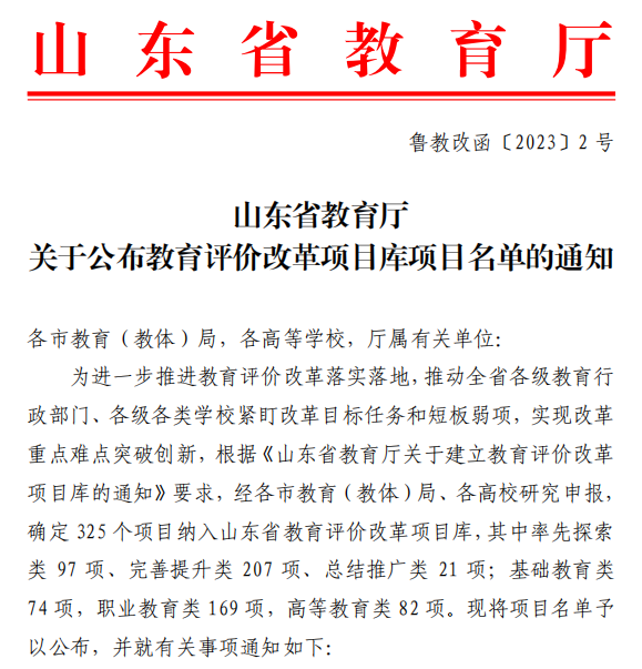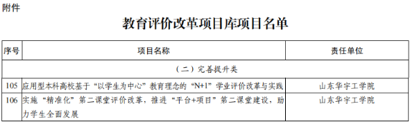 近日,山东省教育厅发布《关于公布教育评价改革项目库项目名单的通知》(鲁教改函〔2023〕2号),我校《应用型本科高校基于“以学生为中心”教育理念的“N+1”学业评价改革与实践》和《实施“精准化”第二课堂评价改革,推进“平台+项目”第二课堂建设,助力学生全面发展》两个项目入选。