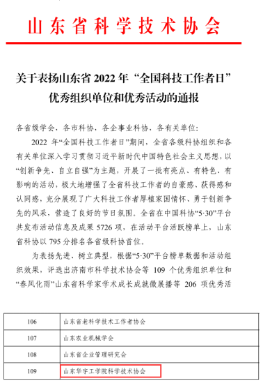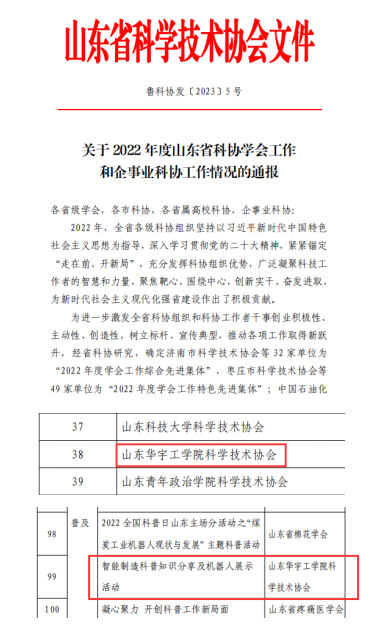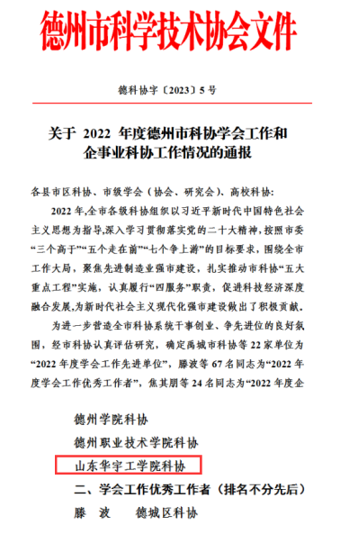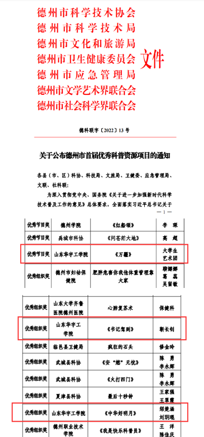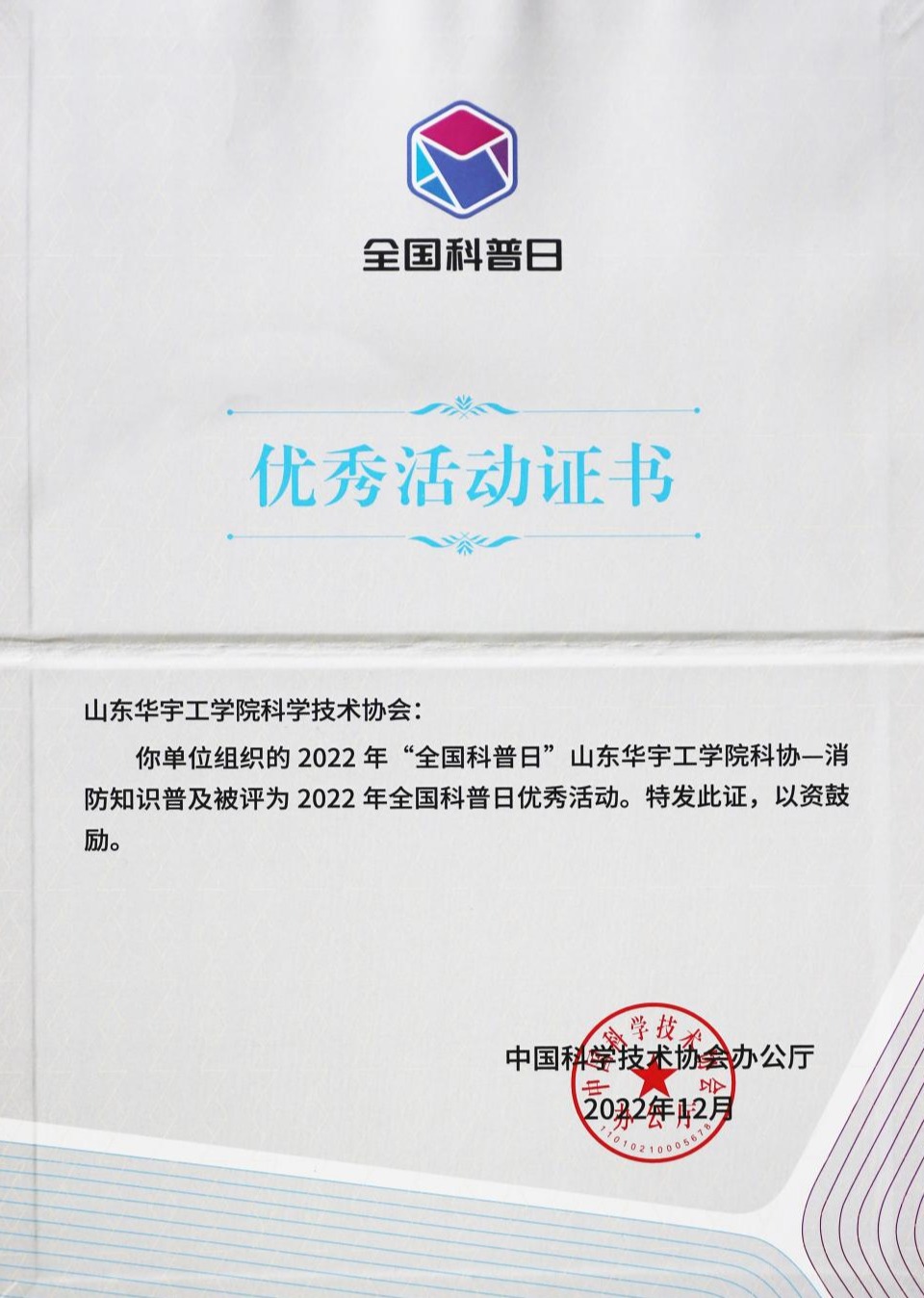 近日,中国科学技术协会办公厅发布了2022“全国科普日”优秀活动名单,我校科协组织的《2022年“全国科普日”香港免费全年资料六大全科协—消防知识普及》活动被评为2022年全国科普日优秀活动。2022年,我校科学技术协会先后荣获2022 年度山东省科协高校科协工作先进集体,山东省“全国科技工作者日”优秀组织单位,德州市2022年度学会工作先进单位,德州市“全国科普日”优秀组织单位。组织的《智能制造科普知识分享及机器人展示活动》被评为2022 年度山东省科协学会工作典型案例。我校科研处、学生工作处、设计与艺术学院被评为德州市“全国科普日”优秀活动单位,在“科普之夜”优秀科普节目征集中,我校大学生艺术团出演的舞蹈《万疆》荣获优秀节目奖,小品《书记驾到》和歌曲《中华好明月》荣获优秀组织奖。