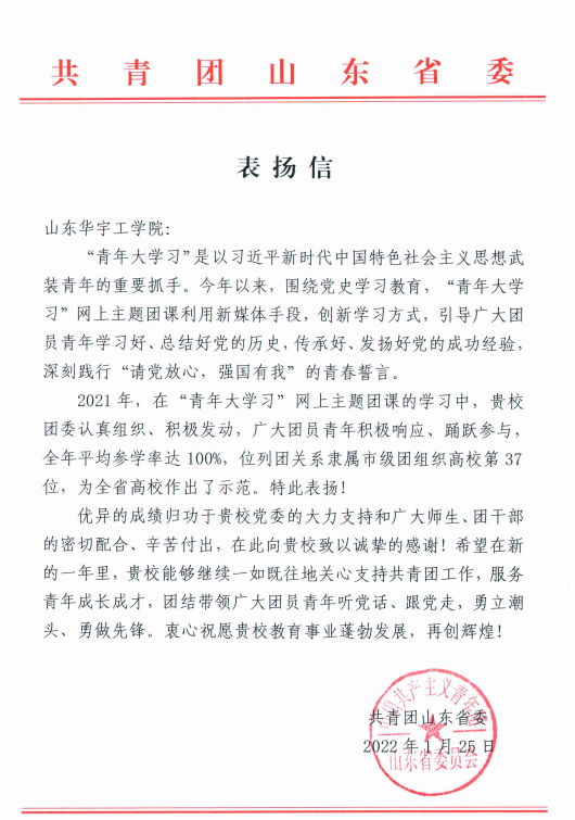近日,共青团山东省委向学校党委寄来表扬信,学校团委在2022年度山东高校共青团工作评价中获得“优秀”等次。自团省委开展全省高校共青团考核评价以来,我校连续三年获此殊荣。
