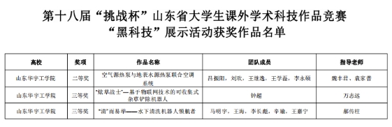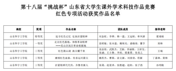 近日,“挑战杯”山东省大学生课外学术科技作品竞赛组委会公布了红色专项和“黑科技”展示活动获奖作品名单。我校荣获红色专项活动特等奖1项、一等奖1项、二等奖1项、三等奖2项,“黑科技”展示活动二等奖1项,三等奖2项,在“挑战杯”竞赛中取得新突破。