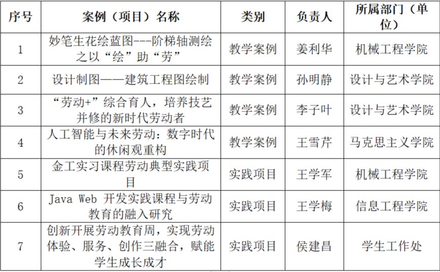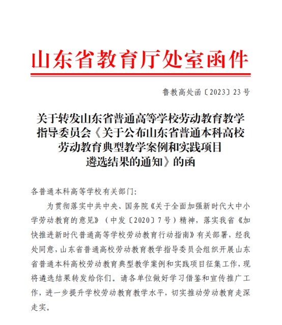 近日,山东省教育厅发布了《关于转发山东省普通高等学校劳动教育教学指导委员会<关于公布山东省普通本科高校劳动教育典型教学案例和实践项目遴选结果的通知>的函》(鲁教高处函〔2023〕23号),我校4个案例入选山东省普通本科高校劳动教育典型教学案例,3个项目入选劳动教育典型实践项目。