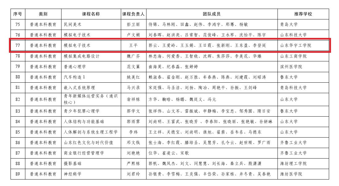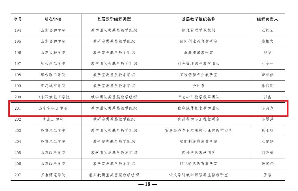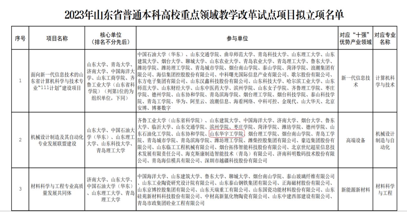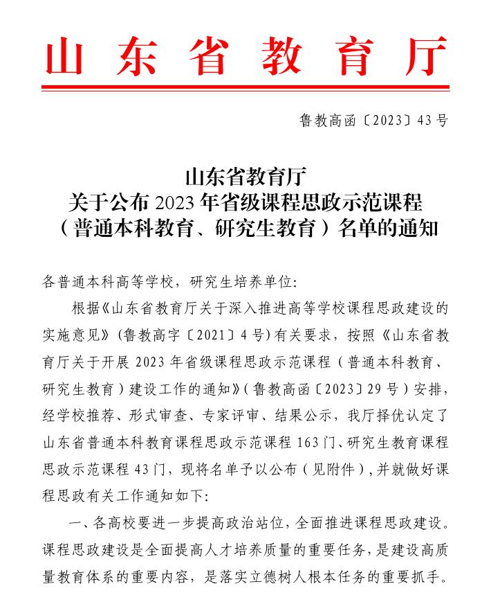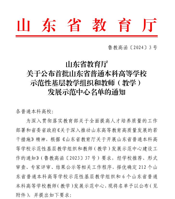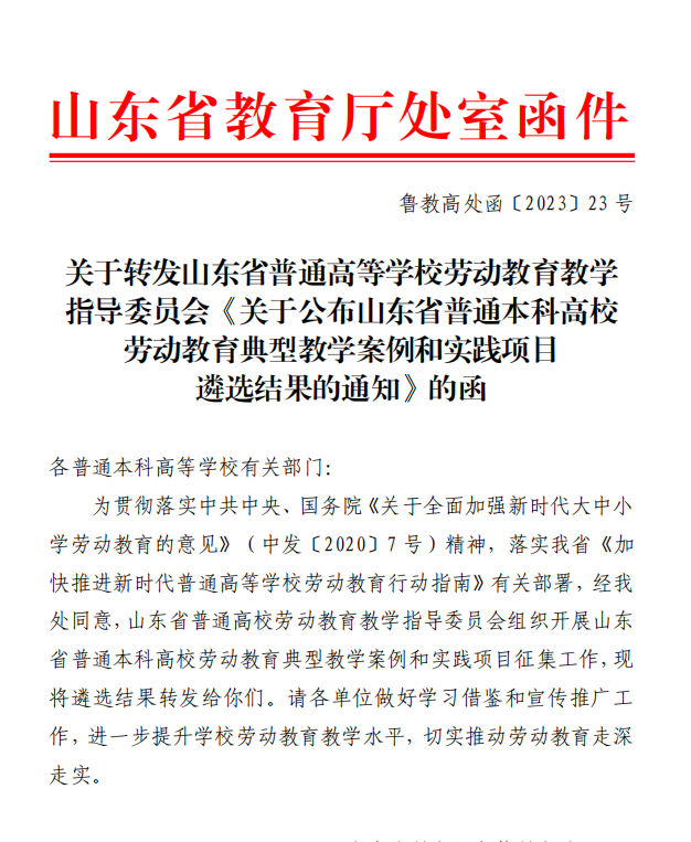 根据《2023年山东省普通本科高校重点领域教学改革试点项目拟立项名单》《山东省教育厅关于公布2023年省级课程思政示范课程(普通本科教育研究生教育)名单的通知》等,我校获批山东省本科高校重点领域教学改革试点项目1项,山东省普通本科教育课程思政示范课程1门,山东省普通高等学校实验教学示范中心1个,山东省普通高等学校示范性实习(实训)基地3个,山东省示范性基层教学组织1个;获评山东省普通本科高校劳动教育典型教学案例4项,山东省普通本科高校劳动教育典型实践项目3项,山东省高等学校课程联盟优秀案例二等奖1项。