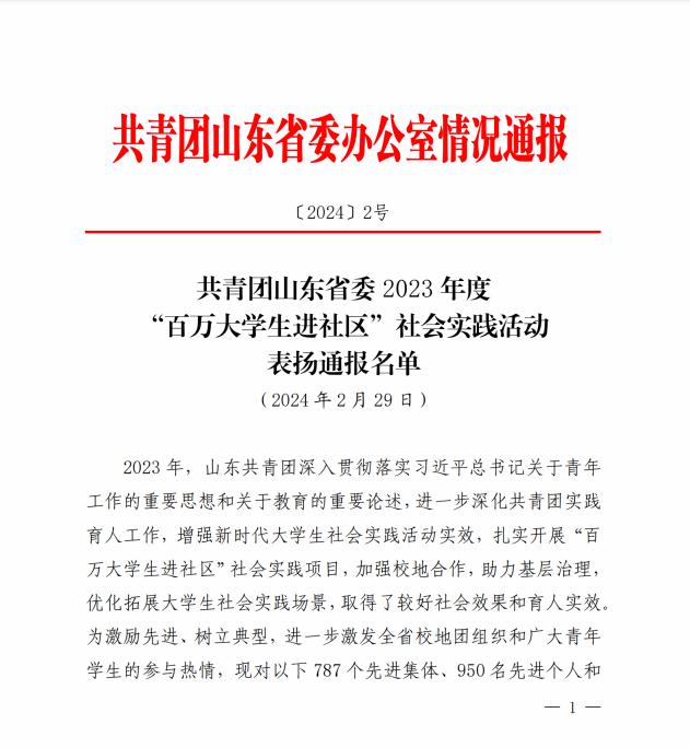 近日,团省委公布了2023年度“百万大学生进社区”社会实践活动表扬通报名单,我校团委获评先进集体,2个团支部获评先进团支部,6名师生获评先进个人,“传承古艺,编织幸福”——传统手工艺进社区项目获评示范项目。