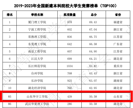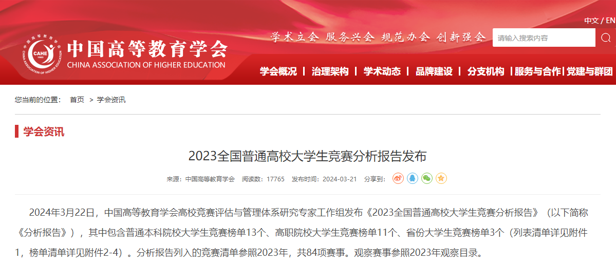 近日,中国高等教育学会高校竞赛评估与管理体系研究专家工作组发布《2023全国普通高校大学生竞赛分析报告》,我校荣登2019-2023年全国新建本科院校大学生竞赛榜单百强,位列第85名。