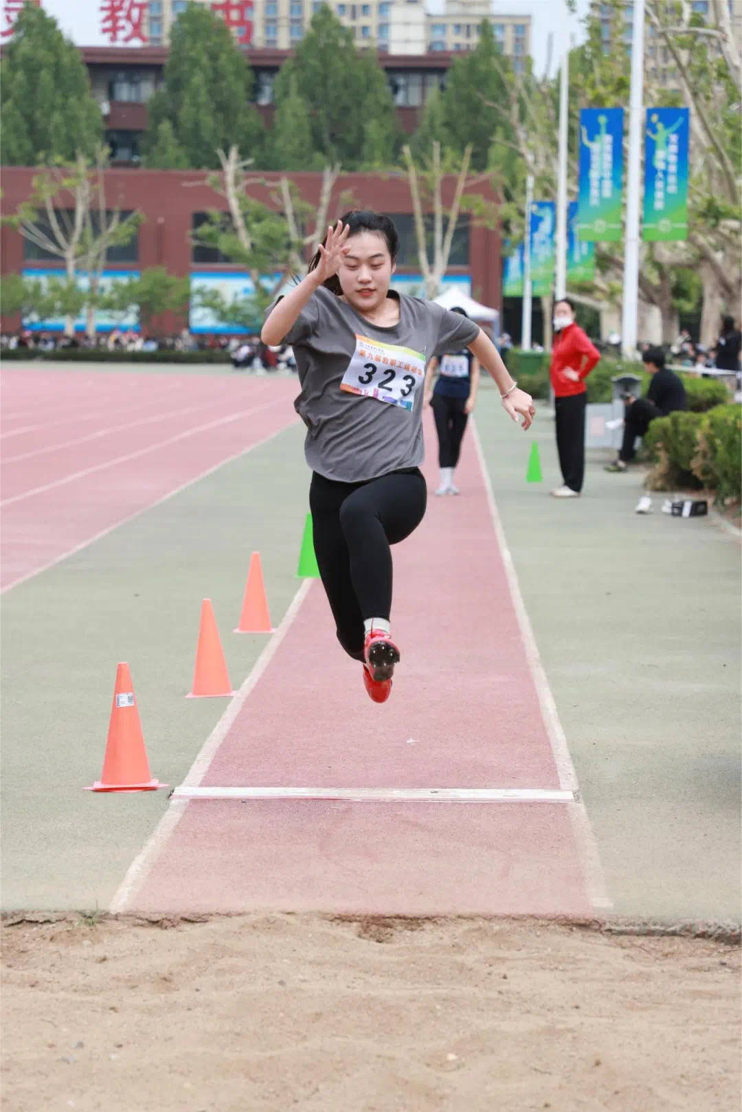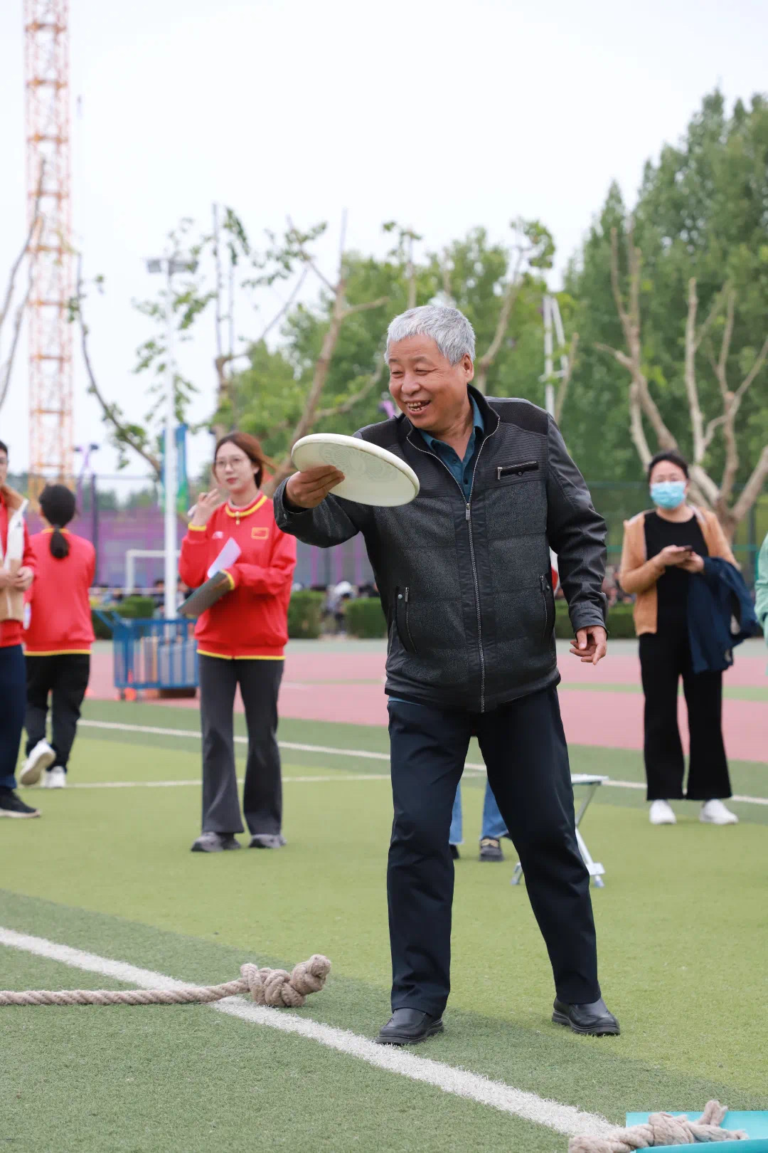 在《歌唱祖国》的乐曲声中,运动员高擎国旗,以昂扬的姿态环绕体育场接力跑一周,点燃了师生爱国热情,伴随着国旗接力环节顺利完成,运动会比赛项目正式开始。