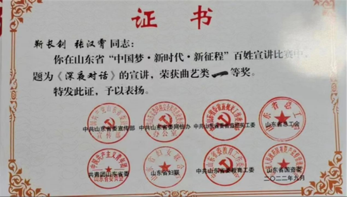 为集中展现全省人民在踏上实现第二个百年奋斗目标新征程上的新作为、新担当、新姿态,迎接党的二十大胜利召开,8月31日至9月2日,由省委宣传部、省委网信办等主办的山东省“中国梦·新时代·新征程”百姓宣讲比赛决赛在济南举行,全省115名百姓宣讲员参加角逐。我校教师靳长钊作品《深夜对话》荣获曲艺类一等奖。