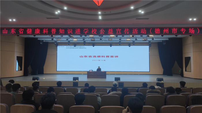 12月17日,山东省健康科普知识进学校公益宣传活动走进我校。本次活动由山东省卫健委、山东省社科联、山东省总工会、山东省疾病预防控制中心指导,山东省健康促进与教育学会主办。市疾控中心党委委员、副主任王壮业,我校教职工和学生代表参加了活动。会议由学生工作处处长助理张群主持。