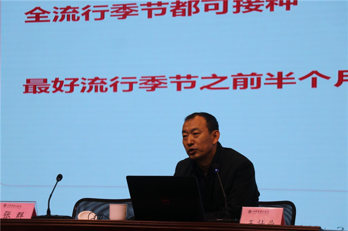 王壮业为大学生们讲解了冬季流感防控的有关知识,结合实际案例详细讲解了流感、肺炎等冬季传染病的传播途径、症状、危害性及预防措施,强调了接种流感疫苗、新冠疫苗的重要性,号召同学们树立良好的生活习惯,做好健康的第一责任人。
