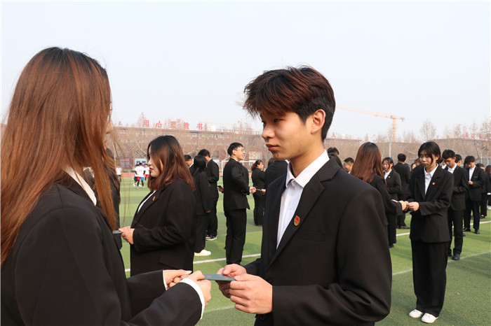 团员代表为新入团团员佩戴团徽、颁发团员证,学生会团总支书记任广奥带领共青团员重温了入团誓词。