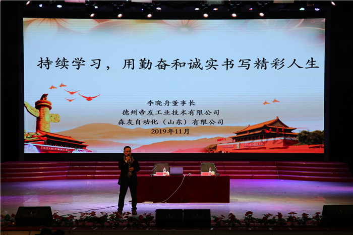11月3日晚,学校“名师讲堂”第四期在华宇国际文化中心举行。德州帝友工业技术有限公司和森友自动化(山东)有限公司董事长李晓舟应邀作了题为“持续学习,用勤奋和诚实书写精彩人生”的报告。全体学生工作人员和2017级专科生参加了报告会,此次报告会由电气工程学院副院长王东盈主持。