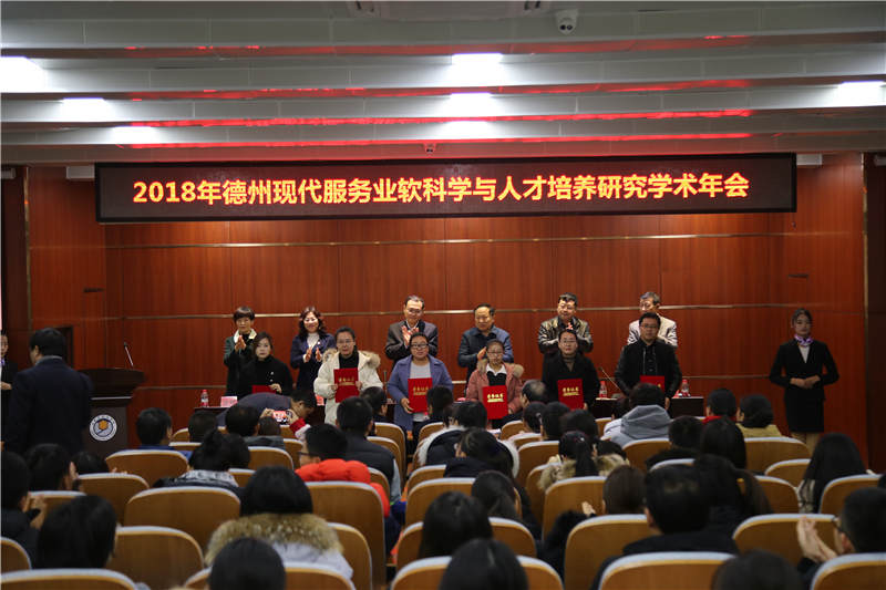 年会分两个环节。第一个环节是年会开幕式。在开幕式上,德州市现代服务业软科学研究基地和德州市现代服务业互联网+创新型人才培养研究基地主任于维同教授做2018年基地工作报告,于教授全面总结了基地2018年所做的工作,客观地描述了所取得成绩,深入地分析了存在的问题,并且科学地规划了基地2019年的工作思路。年会秘书长张文法就本届年会会议论文征集和评审工作做了汇报,据悉年会组委会共收到社会各界投稿108篇,其中82篇收录于学术年会论文集,并评选出34篇优秀论文,分别授予一二三等奖,与会领导为本届年会获得优秀论文奖的作者颁发了证书。颁奖结束后,市社科联副主席刘小文发表了讲话,他指出,学术年会要成为服务发展的智库、学术年会要成为培养人才的摇篮、学术年会要成为学术交流的纽带,此三点建议为基地以后的工作开展指明了思路和方向。开幕式最后夏校长为本次学术年会召开做总结性发言,他指出,研究基地的建设一要准确把握德州市现代服务业经济社会发展过程中的现实问题,提高研究基地的科研水平和成果质量,为市委、市政府的科学决策提供理论支撑和智力支持。二要发挥好基地研究团队的主力军作用,使基地成为区域建设发展的智库,为相关行业企业提供政策咨询和信息服务,积极为区域经济社会发展做出贡献。三要加强对现代服务业人才需求的研究,制定适合德州服务业需求的人才培养方案,科学设置课程,改革人才培养模式,努力培养高规格的适应德州市现代服务业发展的专门人才。年会第二个环节是主题报告会和优秀论文交流环节。首先,辽宁工业大学尹子民教授做了关于现代服务业发展的主题报告,最后获得本届年会优秀论文一等奖的5位作者分别进行了研究论文交流。