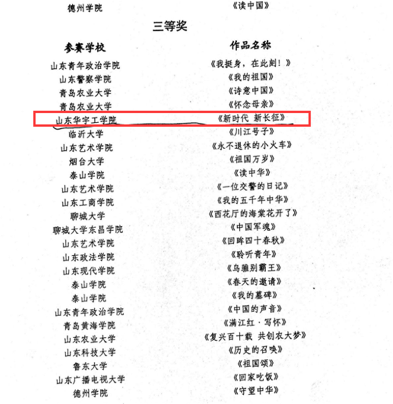 近日,山东省语言文字工作委员会、山东省教育厅印发《关于公布“读中国”山东省大学生诗文朗读大赛获奖名单的通知》(鲁语委函{2018}4号),对“读中国”山东省大学生诗文朗读大赛中获奖的作品予以通报表彰。我校选送的作品《新时代 新长征》在此次大赛中脱颖而出,喜获三等奖。