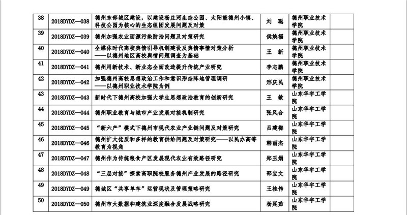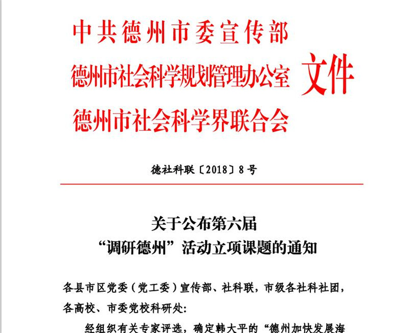 近日,中共德州市委宣传部、德州市社会科学规划管理办公室和德州市社会科学界联合会联合下发《关于公布第六届“调研德州”活动立项课题的通知》(德社科联[2018]8号)文件,我校王敏副教授主持的《新时代下德州高校加强大学生思想政治教育的创新研究》(课题编号:2018DYDZ-043)等30项课题获批立项。
