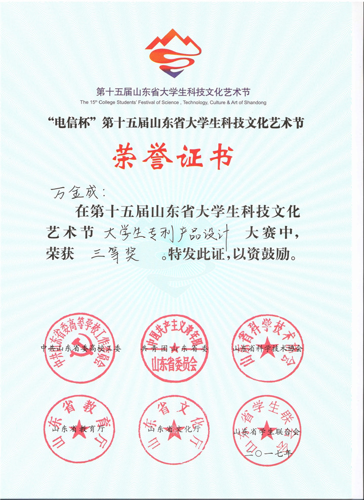 近日,由山东省委宣传部、省委高校工委、团省委、省教育厅、省文化厅、省科协、省学联联合举办的第十五届山东省大学生科技文化艺术节大学生专利产品设计大赛获奖结果公布,我校能源与环境工程学院2014级制冷与空调技术专业学生万金成在比赛中荣获三等奖的优异成绩。