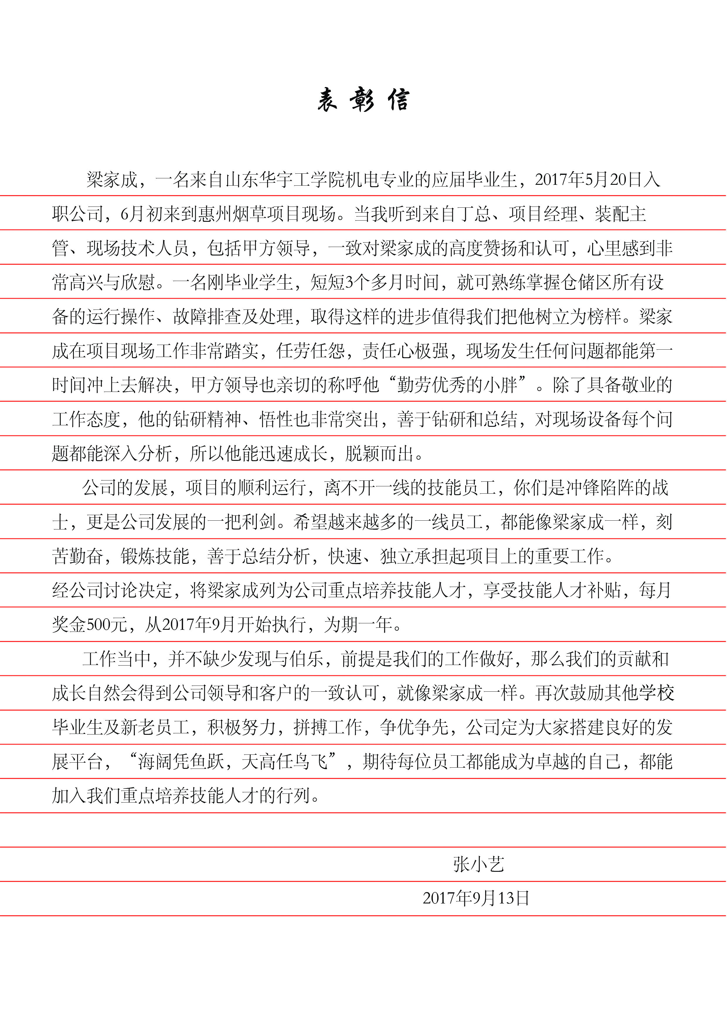 信中谈到,梁家成同学5月20日入职公司,6月初到广东惠州烟草项目现场,在短短3个多月的时间内,就熟练的掌握了仓储区所有设备的运行操作、故障排查及处理。对此,公司领导给与了充分的肯定和赞扬,同时对梁家成在工作中表现出的踏实认真、任劳任怨、勇于担当、敢于挑战的精神也给予了高度的评价。鉴于梁家成同学的突出表现,公司决定将其列为重点培养技能人才,并享受为期一年的技能人才补贴,每月奖金500元。