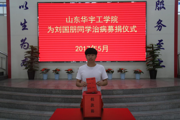 学校了解此事之后,领导们高度重视,立即组织学校团委第一时间向全校师生发出募捐倡议书。5月18日下午,在我校大学生事务中心的大厅里,全校师生为刘国朋同学进行爱心募捐仪式,大家纷纷慷慨解囊、积极捐款,谱写了一曲爱的乐章。一场声势浩大的爱心捐款行动在校园内迅速开展起来,各二级学院、各班级,一张张零用钱,一声声祝福语,一份份心意,一个个牵挂,广大师生纷纷解囊,捐款相助,在校园里传递着爱的温暖与无私的奉献,更为刘国朋同学筑起一道生命的长城。