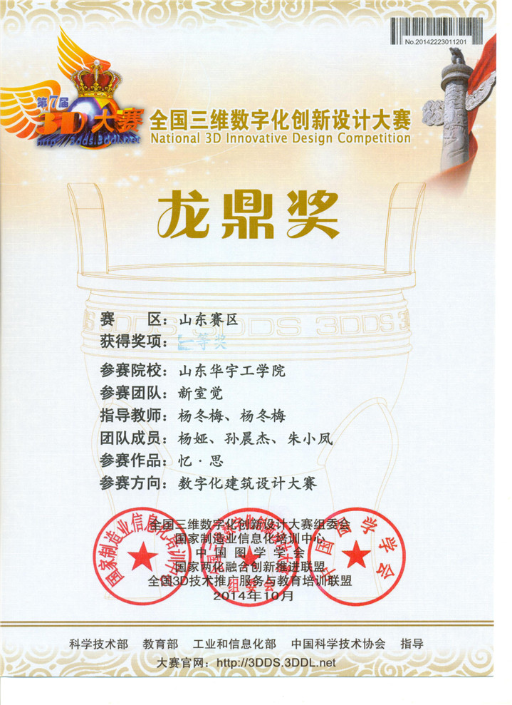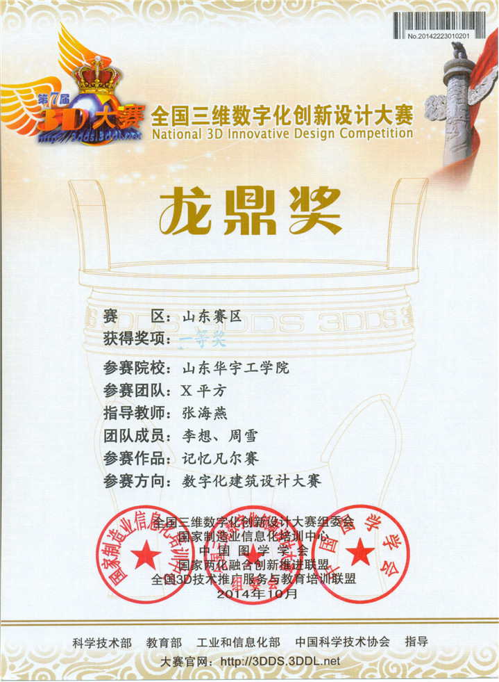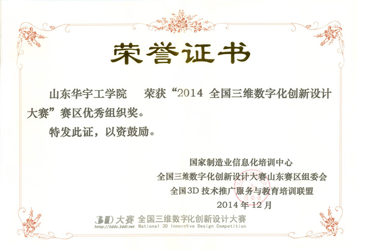 近日,从第七届全国3D大赛方获悉,我院选派的参赛队伍喜获佳绩,获赛区一等奖4项,二等奖4项,三等奖8项,并荣获山东赛区优秀组织奖,为我院建院以来此类赛事获奖数量和涵盖奖项最多的一次。