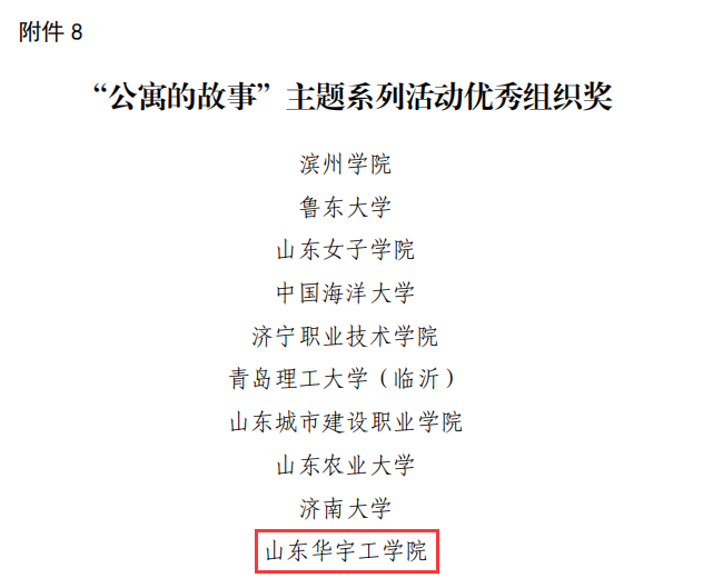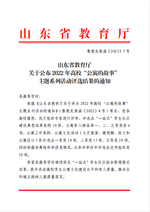 近日,山东省教育厅公布了2022年高校“公寓的故事”主题系列活动评选结果,我校荣获一等奖2项、二等奖1项、三等奖2项的优异成绩,同时荣获优秀组织奖。