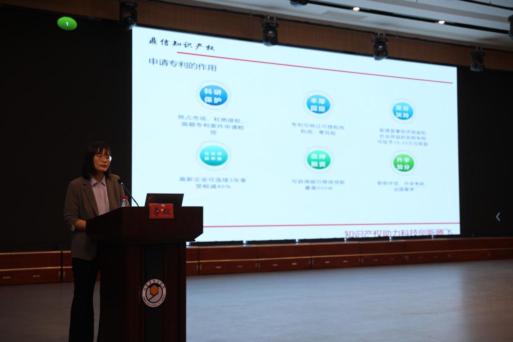 李双老师详细解读了专利内涵和类型,分析了不同类型专利在保护期限、保护对象、保护内容等方面的差异,讲解了专利申请流程及专利申请文件的构成,并运用大量实例启发大学生如何挖掘专利。同时,她细致介绍了高价值专利的界定和标准,以及专利快速预审的通道,与会师生认真聆听,并在会后进行了互动交流。