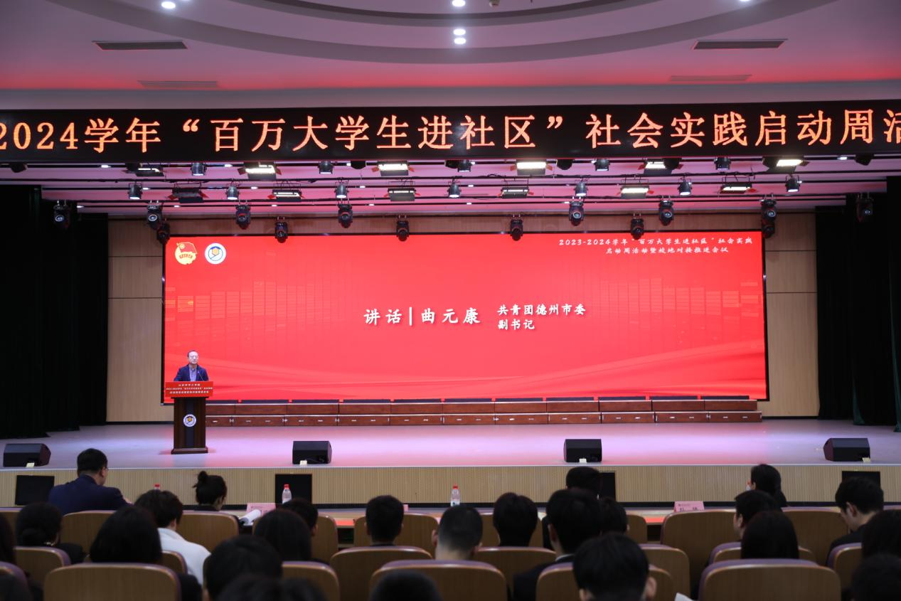 为进一步深化“百万大学生进社区”社会实践工作,11月25日,我校2023-2024学年“百万大学生进社区”社会实践启动周活动暨校地对接推进会议在大学生活动中心三馆举行。共青团德州市委副书记曲元康、德州市少先队总辅导员杨明菲、共青团德城区委书记李凯、天衢新区党群工作部统战群团办公室主任孙贤,宋官屯社区、绿城社区等17个结对社区负责人出席会议,校团委全体成员,各二级学院团总支书记、团支部代表共700余人参加会议。