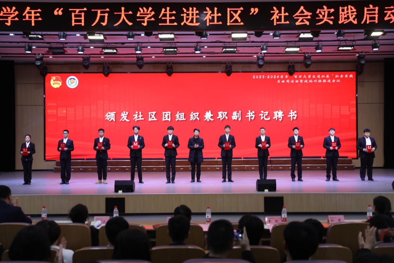 仪式上,与会人员共同观看了《青春在实践中绽放》视频,校团委负责人介绍了学校“百万大学生进社区”社会实践工作开展情况,发布18项“百万大学生进社区”社会实践项目清单;结对社区负责人与各二级学院团总支书记共同为新成立的大学生社区实践基地揭牌;李凯和孙贤分别为新聘任的社区团组织大学生兼职副书记和社区大学生兼职网格员代表颁发聘书。