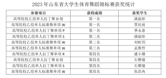 本次赛事由山东省学校体育协会主办,经过激烈角逐,我校学生凭借良好的现场表现,脱颖而出,获得评委一致好评。其中,学生满淑彤获得高等院校乙组单人拉丁舞D级第一名,贾欣雨获得高等院校乙组单人华尔兹舞第一名,季永意获得高等院校乙组单人斗牛舞第一名。