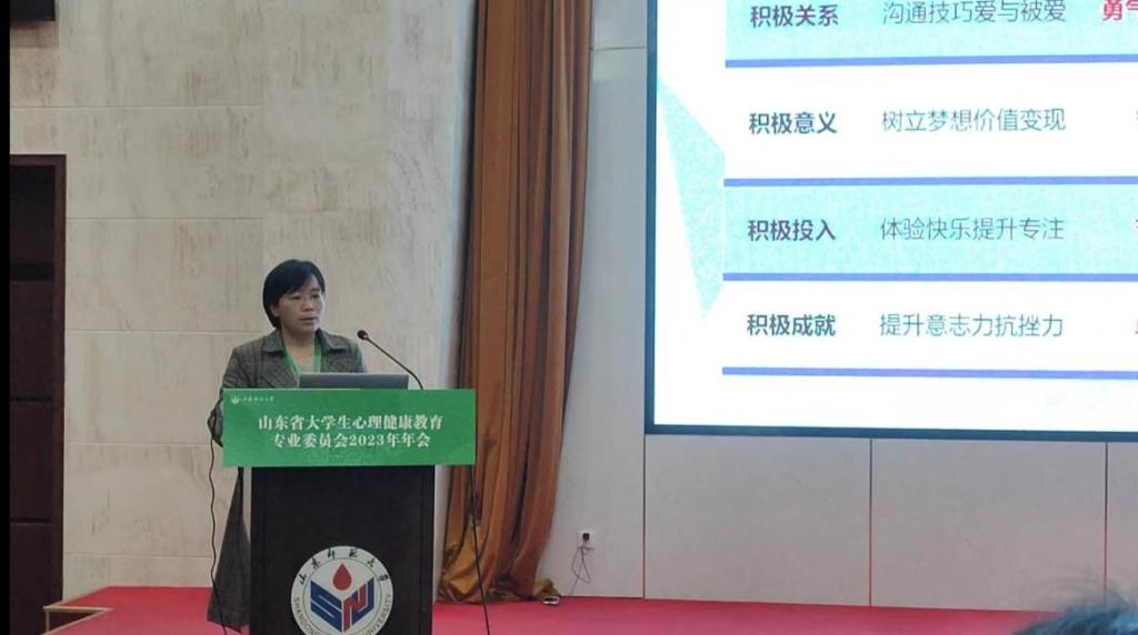 学校学生工作处副处长、大学生心理健康教育中心主任栗新燕在大会上作题为“‘五位一体’朋辈心理辅导 护航学生健康成长”的工作经验分享,介绍了学校“1244”大学生心理健康教育工作机制、“五位一体”朋辈工作模式,着重分享了“YU你逐心梦”积极心理品质提升营相关内容。