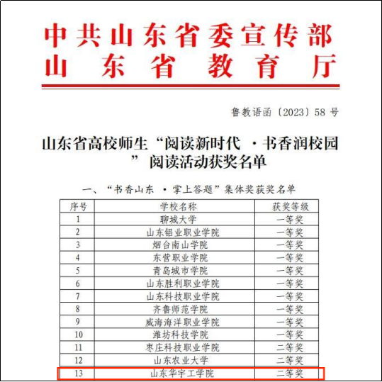 近日,山东省教育厅公布了“山东省高校师生‘阅读新时代·书香润校园’阅读活动”获奖名单,我校学生荣获一等奖15项、二等奖7项、三等奖27项,学校荣获集体奖二等奖。