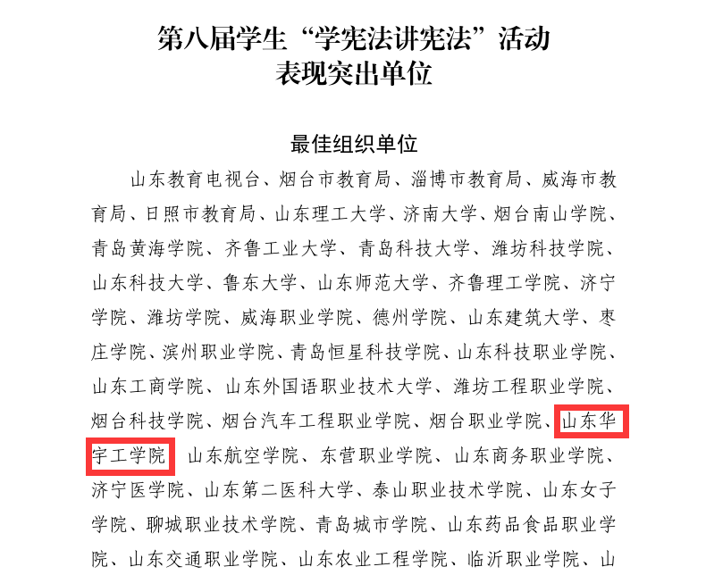 近日,山东省教育厅公布第八届学生“学宪法 讲宪法”活动开展情况,我校获评“最佳组织单位”,5位教师获评“表现突出个人”,2名学生获“学宪法 讲宪法”活动山东赛区演讲比赛、素养竞赛三等奖。