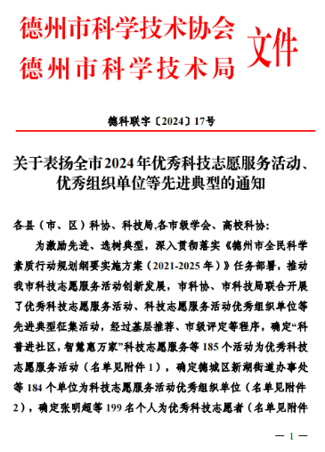 近日,德州市科学技术协会、德州市科技局发布“关于表扬全市2024年优秀科技志愿服务活动、优秀组织单位等先进典型的通知”,我校3项活动荣获优秀科技志愿服务活动、4个教学单位被评为科技志愿服务活动优秀组织单位、3名教师被授予优秀科技志愿者称号。