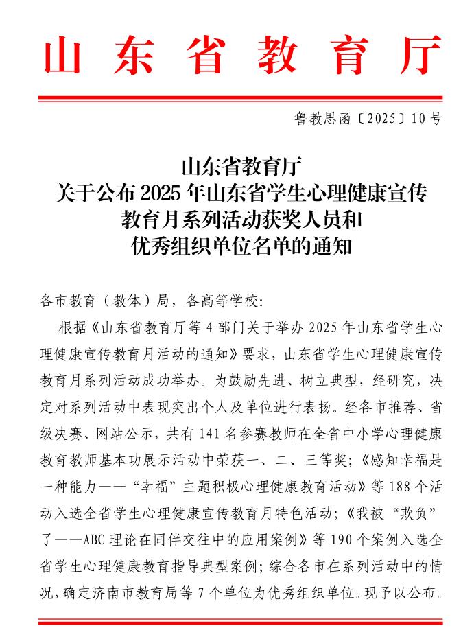 近日,山东省教育厅公布2025年山东省学生心理健康宣传教育月展示活动获奖名单,我校1项特色活动、1个典型案例获奖。
