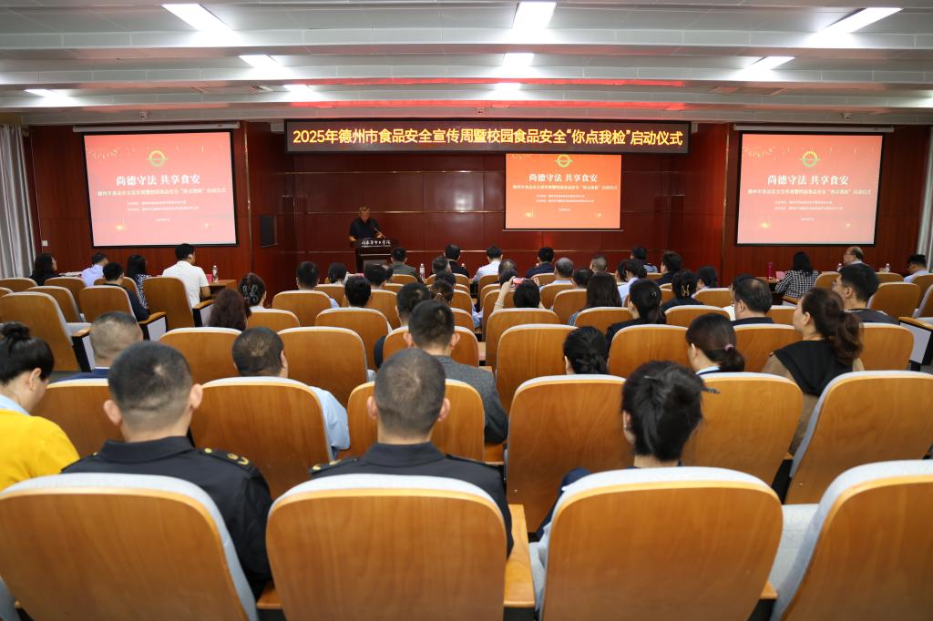 9月22日,2025年德州市食品安全宣传周暨校园食品安全“你点我检”启动仪式在我校举行。市食药安办副主任、市市场监管局副局长闫洪卫,天衢新区管委会副主任董伯驹,学校校长助理魏丰君,相关部门单位负责人等约200人参加活动。
